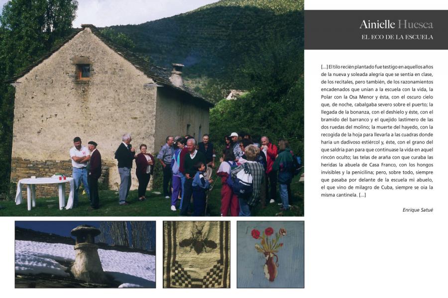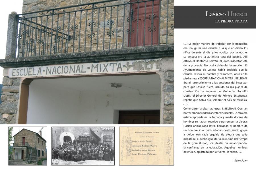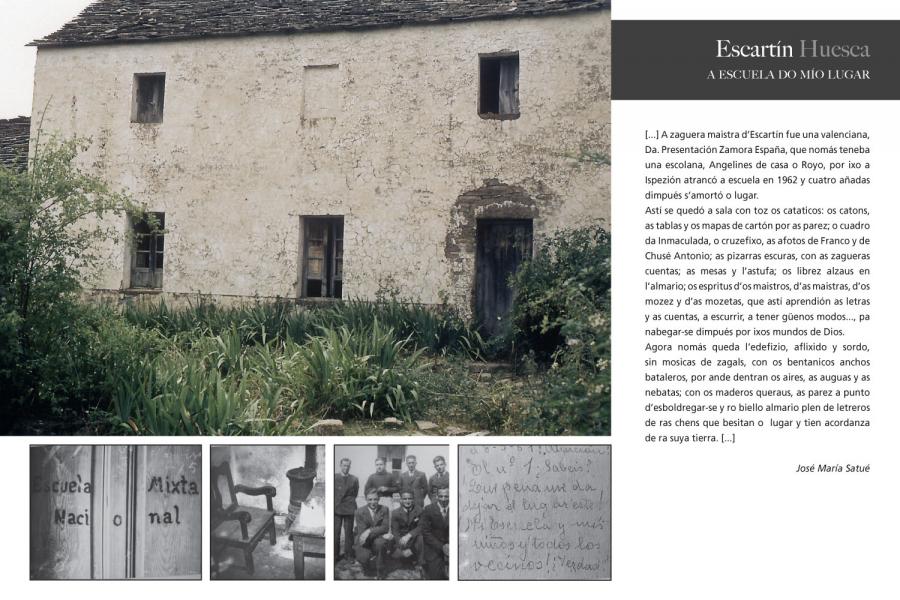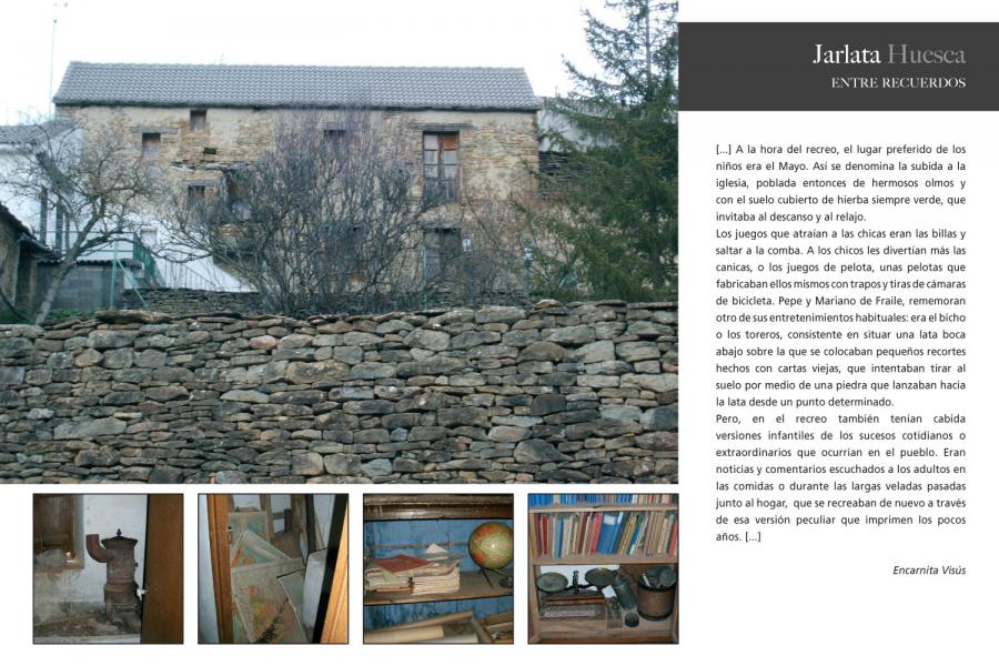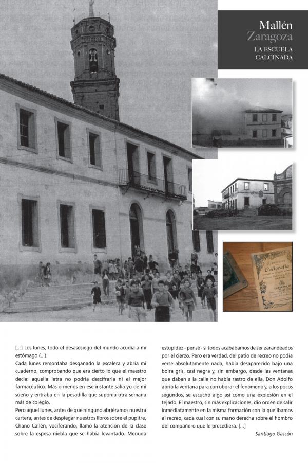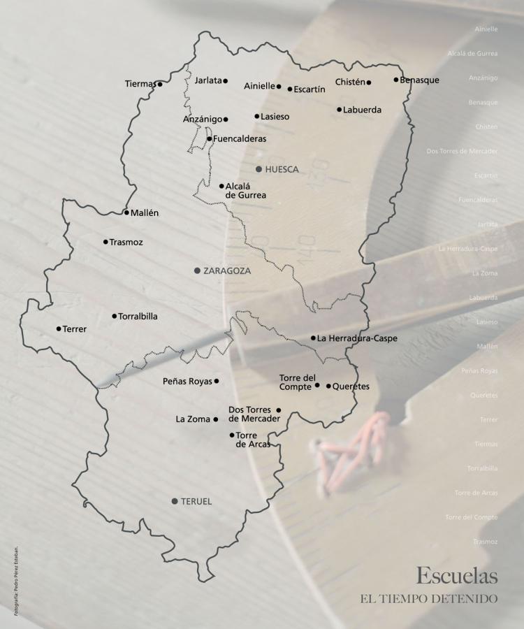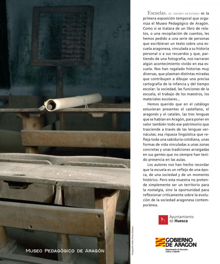 Escuelas. El tiempo detenido es la primera exposición temporal que organiza el Museo Pedagógico de Aragón. Como si se tratara de un libro de relatos, o una recopilación de cuentos, les hemos pedido a una serie de personas que escribieran un texto sobre una escuela aragonesa, vinculada a su historia personal o a sus recuerdos: a su abuelo o a sus padres, al pueblo de su infancia, historias que habían escuchado… y que, partiendo de una fotografía, nos narraran algún acontecimiento vivido en esa escuela. Nos ha regalado historias muy diversas, que plasman distintas sensibilidades, distintas miradas que contribuyen a dibujar una precisa cartografía de la infancia y del tiempo escolar. Nos han regalado textos que hablan de la sociedad, de las funciones de la escuela, del trabajo de los maestros, de los materiales escolares… La estufa de Trasmoz, el admirado profesor de Torralbilla, el temido maestro de Mallén, el buen hacer de Doña Leonor en Ainielle, los juegos en el recreo de Jarlata, las labores de las niñas en Anzánigo, la convivencia en la Escuela-Hogar de Teruel de los niños de Dos Torres de Mercader, los innovadores métodos pedagógicos en Alcalá de Gurrea, los exámenes de La Herradura, en Caspe, los cuadernos de Chistén, la caligrafía y las cuentas en Terrer, las clases relegadas por las tareas en el campo en Torre del Compte… nos dibujan un ambiente que recrea una época: podríamos estar hablando de cualquier escuela.