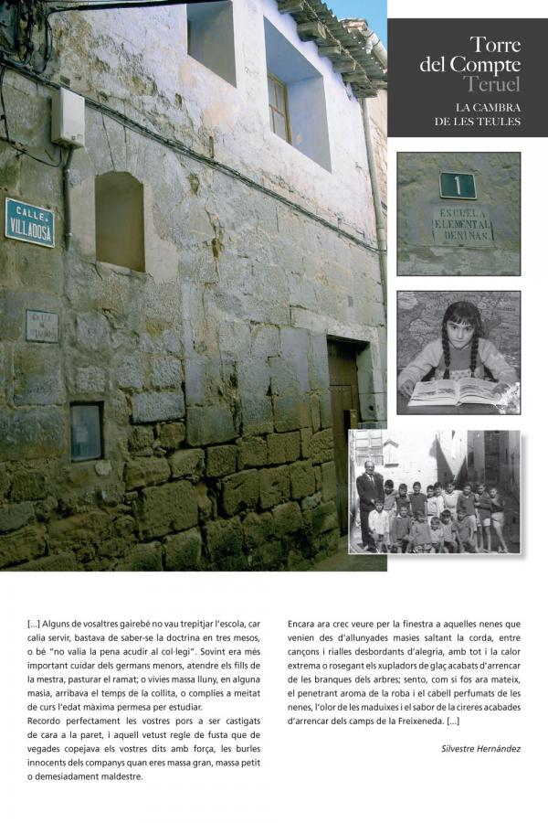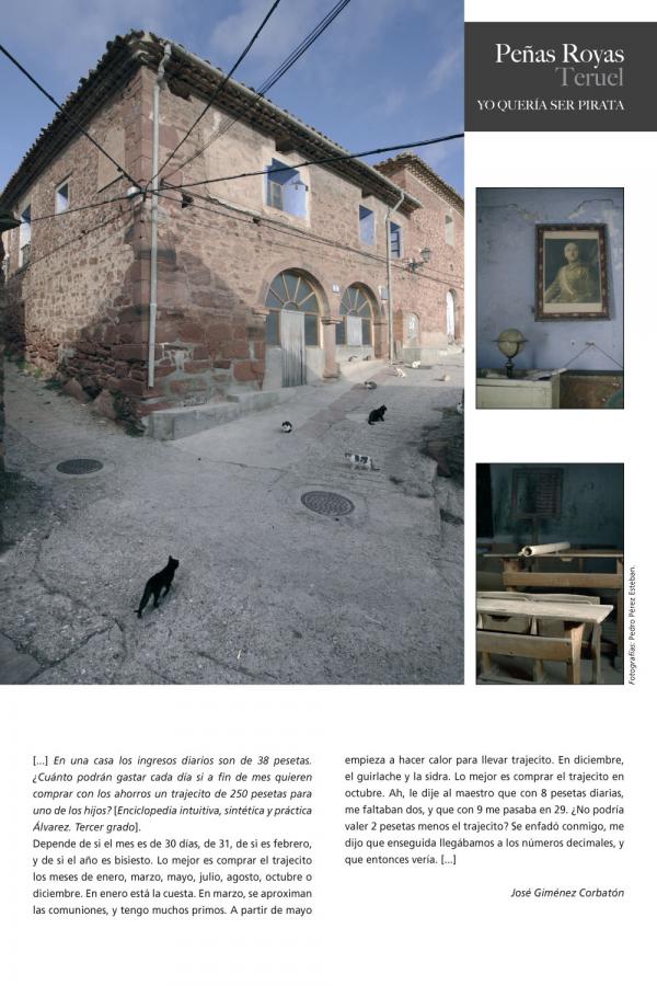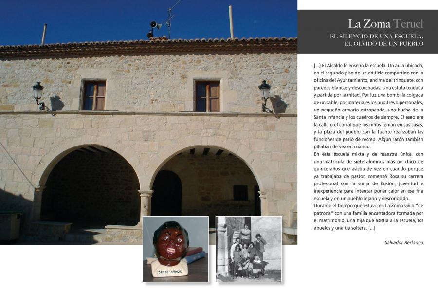 Pero nuestro propósito no era hablar de mundos perdidos. Escuelas cerradas, quemadas, edificios reutilizados, pueblos anegados por pantanos, centros reunificados por falta de alumnos en pequeñas poblaciones… sólo son el punto de partida para recuperar el estilo de enseñanza y los métodos pedagógicos que reflejaron un modo de vida. Maestros autoritarios que imponían las lecciones a golpe de regla, maestras entregadas a alumnos de distintas edades, estufas en medio de la clase para combatir el frío del invierno, la lista de los reyes Godos, los ríos y los cabos de la Península Ibérica… pero también el respeto por los profesores, el valor del esfuerzo, la inocencia de los juegos infantiles…