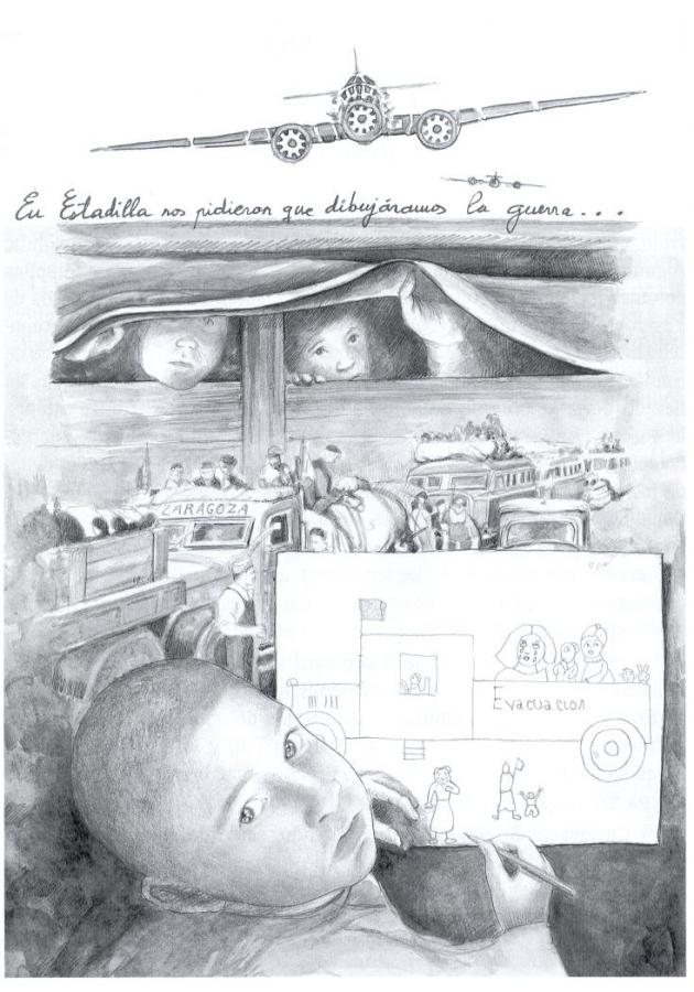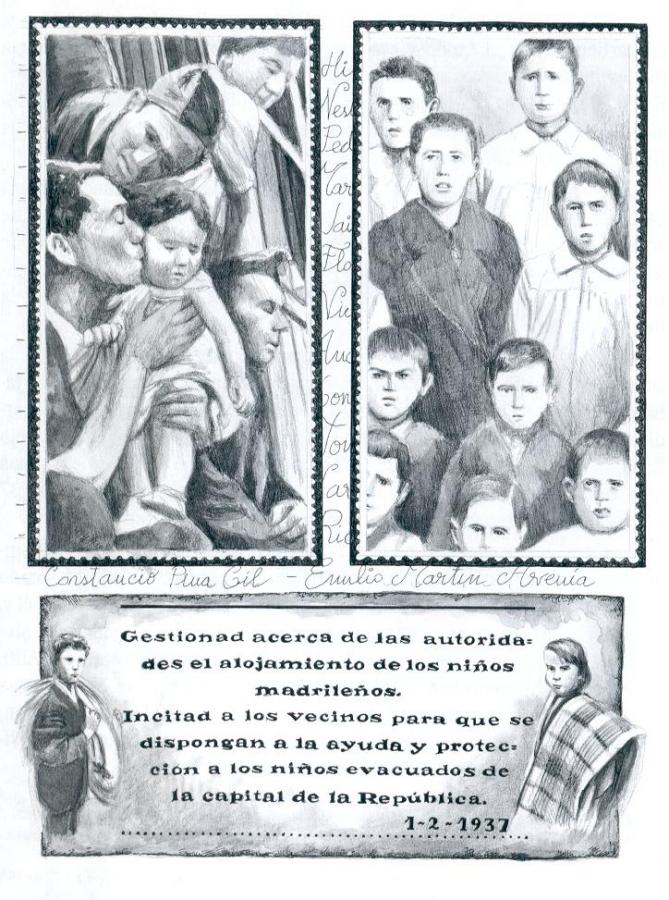 La exposición recoge las ilustraciones que Roberto L’Hôtellerie realizó para iluminar el libro Los niños del frente de Enrique Satué (2003 y 2007) en el que se cuenta la historia de las colonias escolares que el Gobierno de la República organizó para alejar a los niños de los horrores de la guerra.