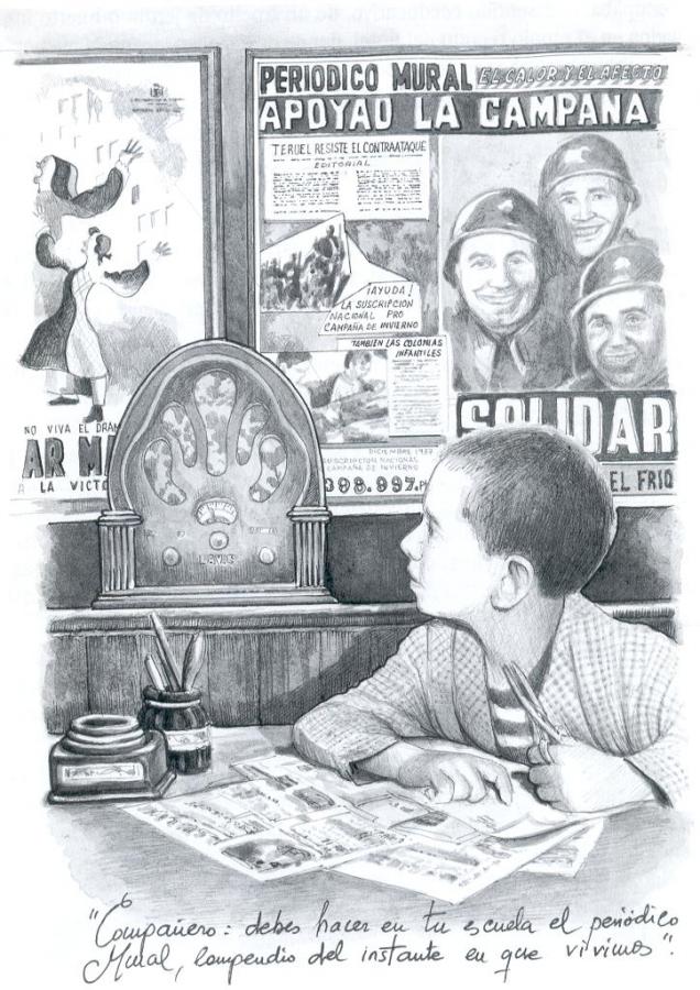 Los dibujos de Roberto L’Hôtellerie son un fiel reflejo de los objetos, la tipografía, los ambientes y las situaciones de la guerra civil española.