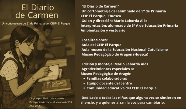 El pasado martes, en la recreación del «Aula del nacional catolicismo» del museo, tuvo lugar una grabación muy especial. Se trata de «El Diario de Carmen», un cortometraje educativo creado por el alumnado de 5º de Primaria del CEIP El Parque (Huesca), en el marco de la asignatura de Atención Educativa, valores y lengua castellana y literatura. El proyecto nace con la intención de reflexionar sobre las desigualdades de género en el contexto escolar, conectando pasado y presente a través del lenguaje audiovisual.