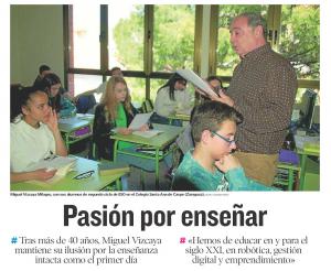 La última entrevista publicada por Víctor Juan en «Heraldo Escolar», el suplemento de educación de Heraldo de Aragón, está dedicada a Miguel Vizcaya, maestro del colegio Santa Ana de Caspe, en el cual lleva ejerciendo su profesión más de 40 años.En el siguiente enlace puede leerse la columna completa en formato PDF: